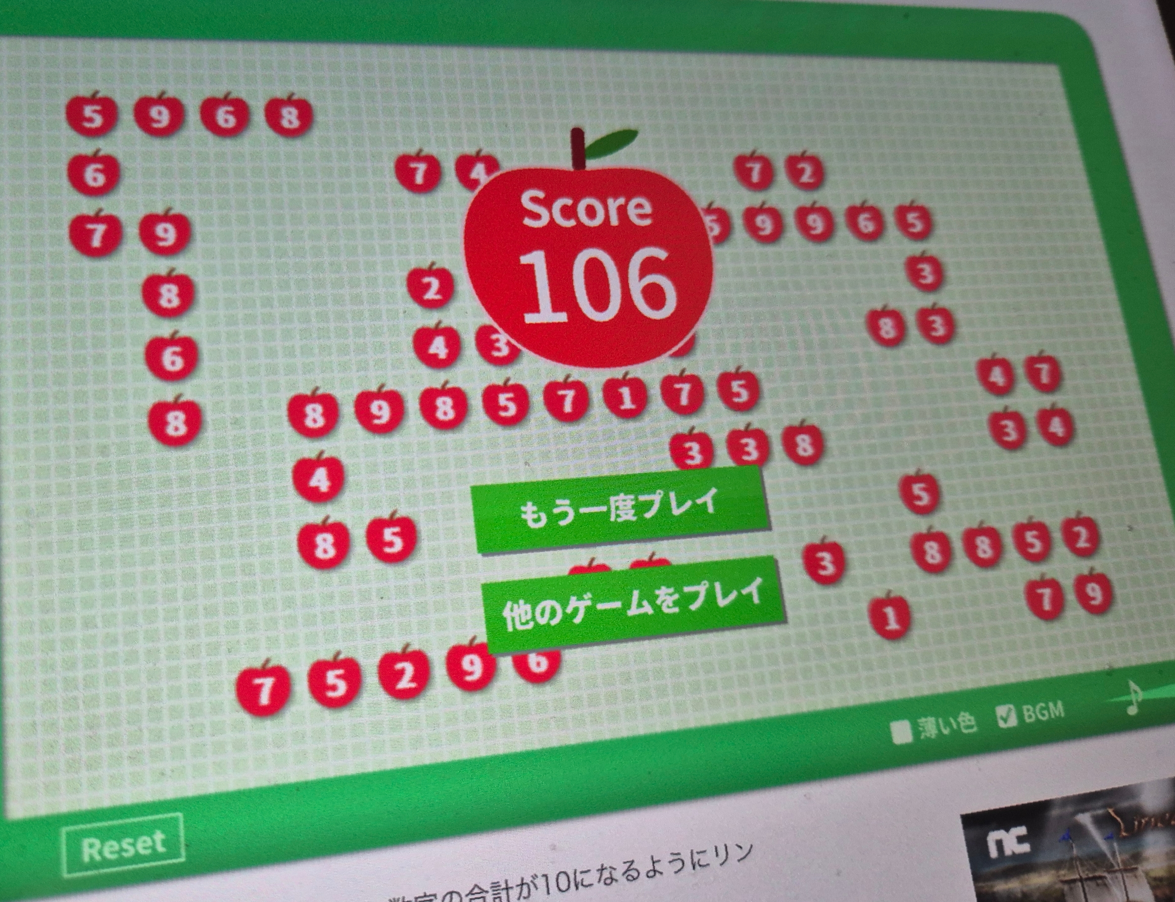画面上をマウスでドラッグして、数字の合計が10になるようにリンゴを囲むパズルゲームです。(説明) iPhone,iPadやAndroidでも動作します。