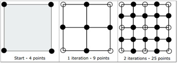[그림]은 0단계(start)에서 2단계(2 iterations)까지 수행한 결과이다. 각 단계(N)가 계속해서 커져갈수록 점의 수가 커져간다.