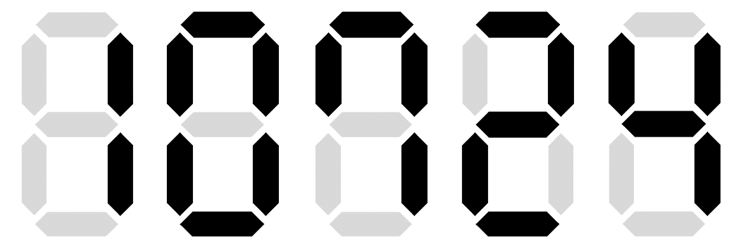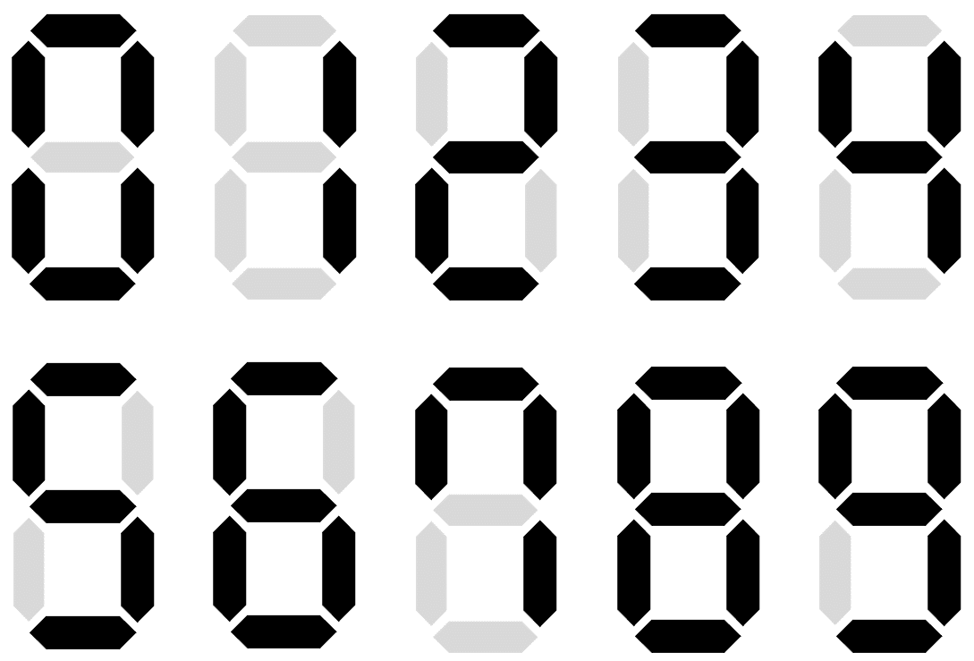 8자 모양의 전구 묶음은 0부터 9까지의 숫자를 표현할 수 있으며, 표현 방법은 아래와 같다. 아래 그림에서 전구가 켜졌으면 검정색, 꺼졌으면 옅은 회색으로 표현되었다.