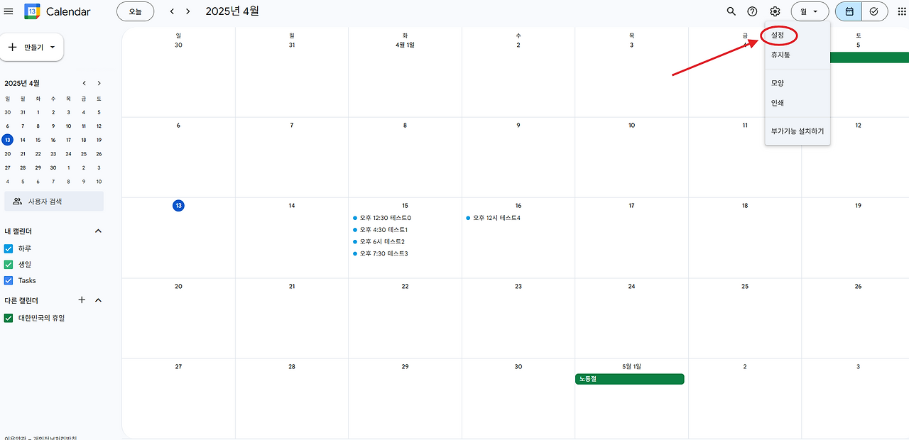 요일은 우리가 익숙한 일월화수목금토 순서대로 정렬되고, 각 날짜 셀 안에 일정 정보가 깔끔하게 들어가도록 구현했습니다.