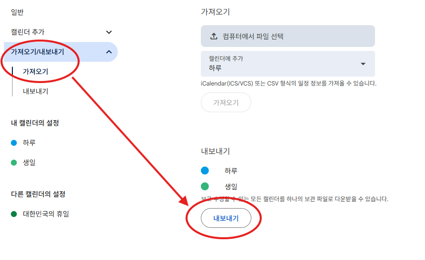 - [캘린더 설정 → 내보내기]를 통해 .ics 파일을 받을 수 있어요.