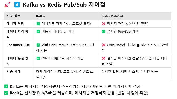 카프카는 메시지를 저장하면서 스트리밍을 지원하고 Redis는 실시간 Pub/Sub을 제공하며 메시지를 저장하지 않는다.