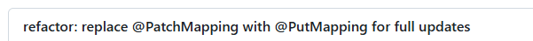 feedback > @PatchMapping의 경우에는 data의 일부만 수정할 때 쓰고 Dto 전체를 받는다면, 심지어 validation도 하는 경우에는 Put을 쓰는게 맞다. 다 변경하자. Patch는 부분만 수정하고 통상적인 컨벤션(createdAt, updatedAt)을 제외한 것들을 수정할 때 사용한다.